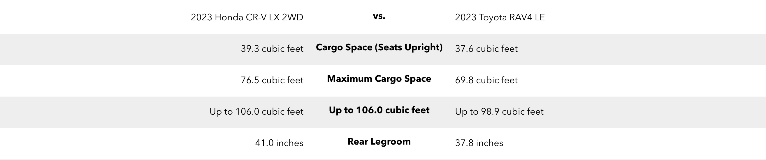 Both the Honda CR-V and the Toyota RAV4 seat up to five, but that certainly doesn’t mean that your passengers will feel the same way about both vehicles. After all, the new CR-V wins out in all the areas where space really counts: