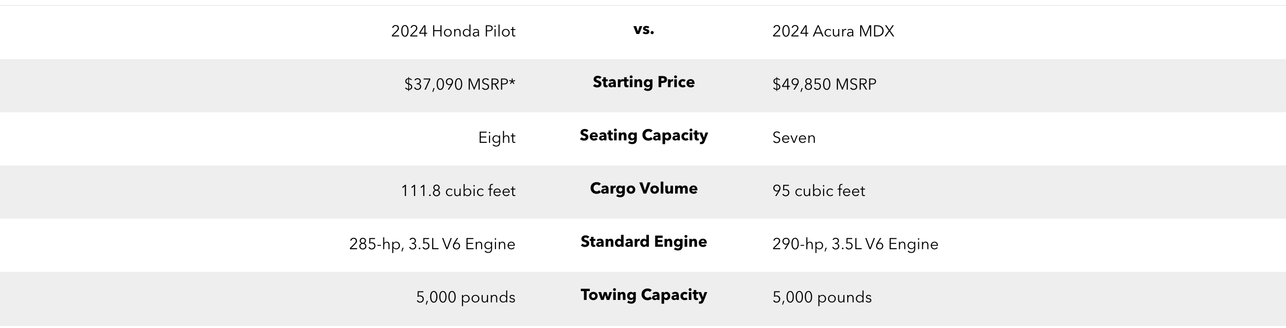 Which is more spacious, the MDX or Pilot? The Honda Pilot wins this round, offering more cargo space to store your belongings and room for an additional passenger. Compare the interior dimensions of the Honda Pilot vs. Acura MDX below.